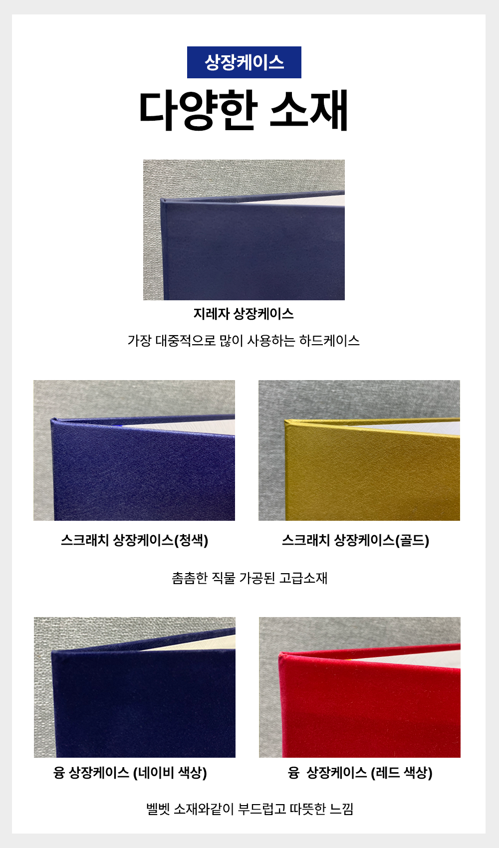 저희 학림프린트에서는 다양한 상장케이스의 소재와 인쇄를 선택하실 수 있습니다.