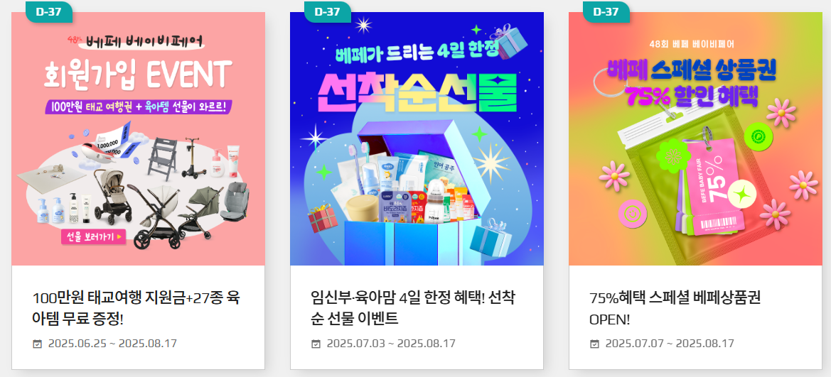 | 100만 원 태교여행 지원금 + 27종 육아템 증정 | 2025.06.25 ~ 2025.08.17 | 베페 회원 대상, 추첨을 통해 태교여행권과 육아 용품 패키지 제공 (befe.co.kr) |