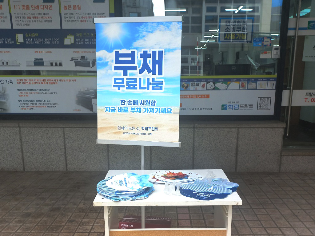 매장 입구에서 부채를 자유롭게 가져가실 수 있도록