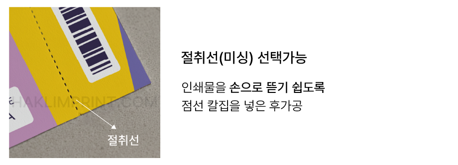 인쇄물을 손으로 뜯기 쉬운 절취선 선택 가능합니다.