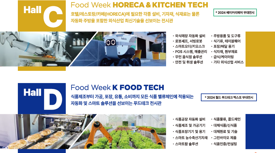 | 전시 품목 / 주요 콘텐츠 | 간편식품, 가공식품, 신선식품, 건강식품, 조미식품, 원료/첨가물, 디저트/베이커리, 음료/스페셜티 푸드, 비건/대체식품, 외식/급식 솔루션, 스마트 주방가전/주방용품, 식품 제조 및 포장 설비, 스마트 유통 / 물류 해법 등 |