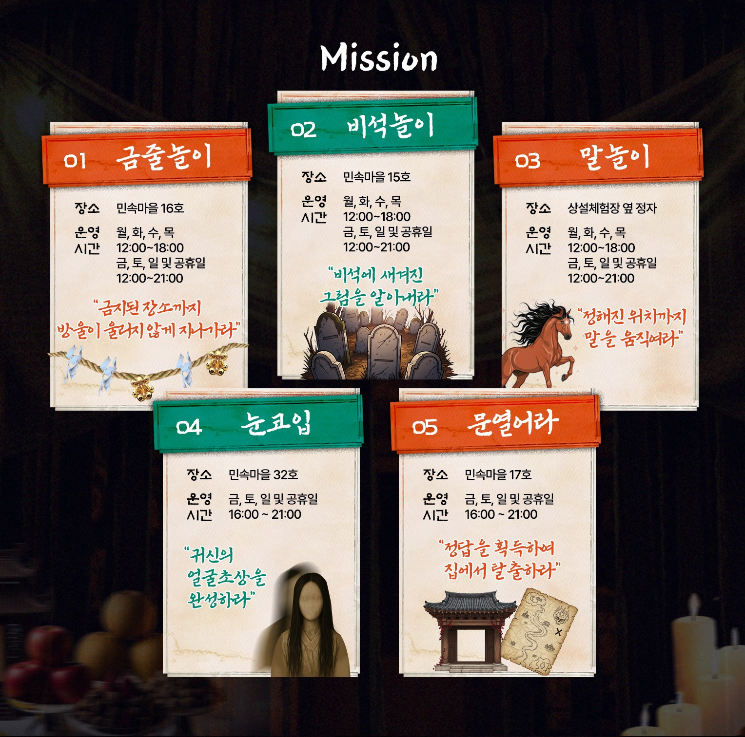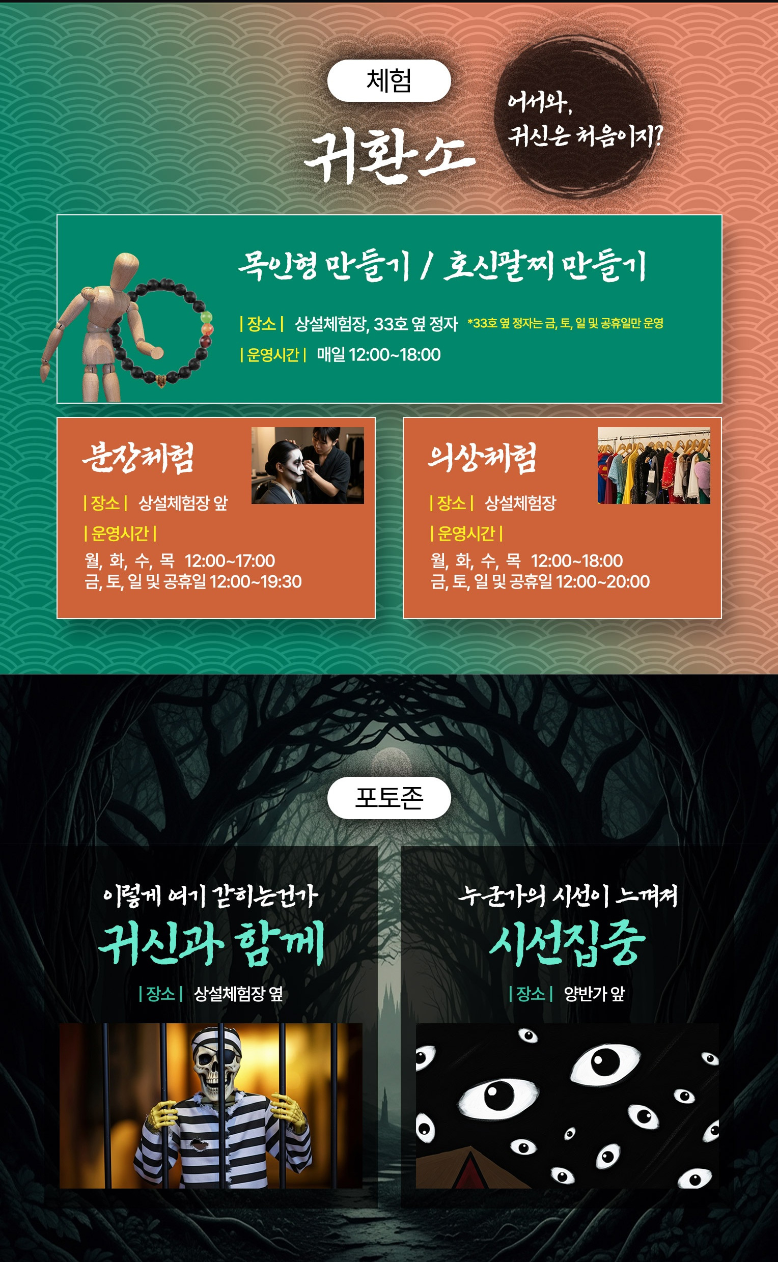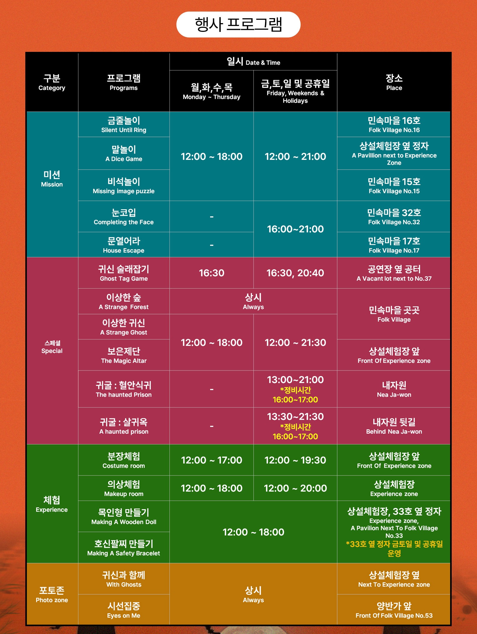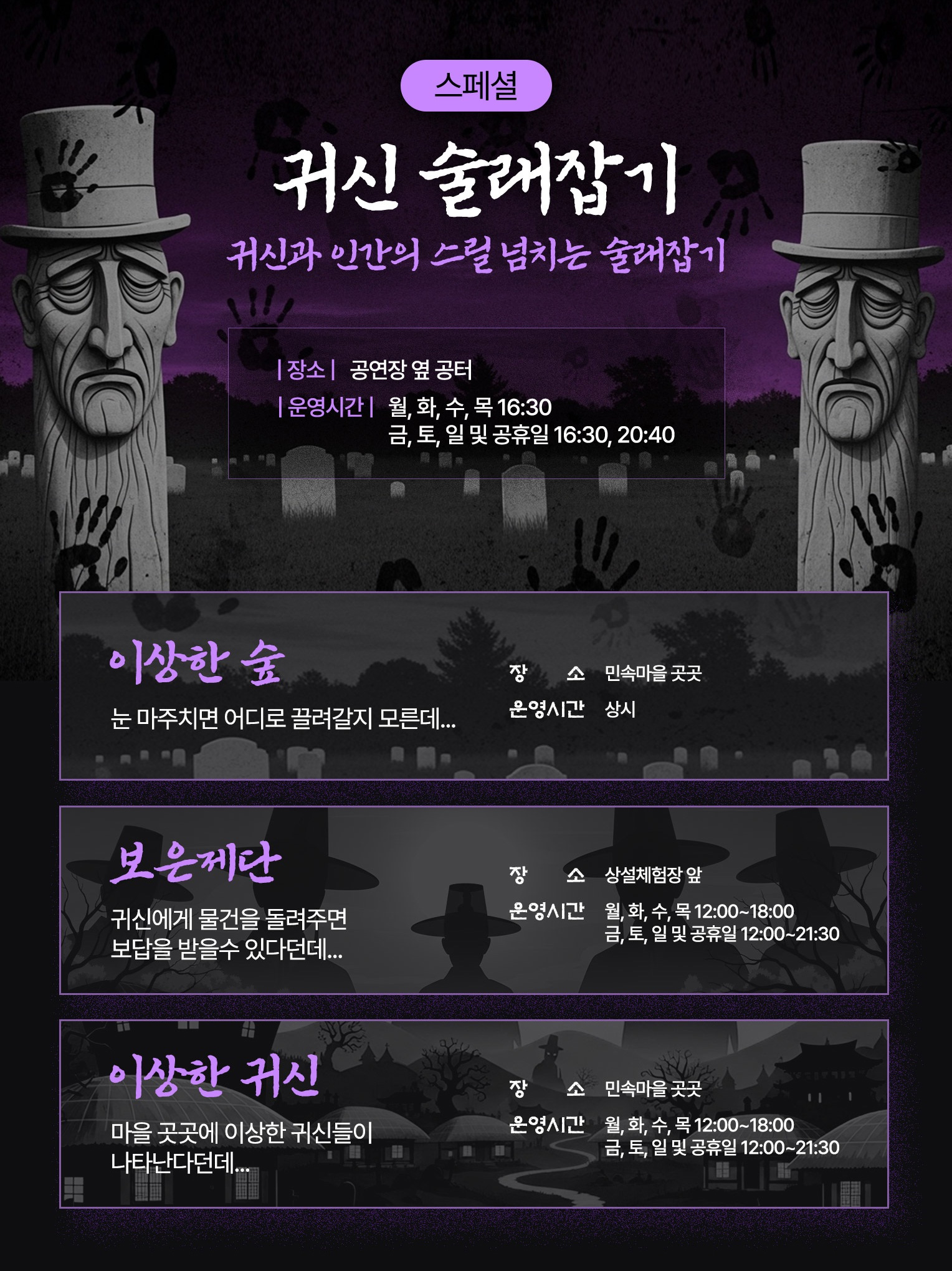 전통 민속 마을의 분위기에 한국식 공포 콘텐츠를 결합한 독특한 호러 체험형 행사입니다.