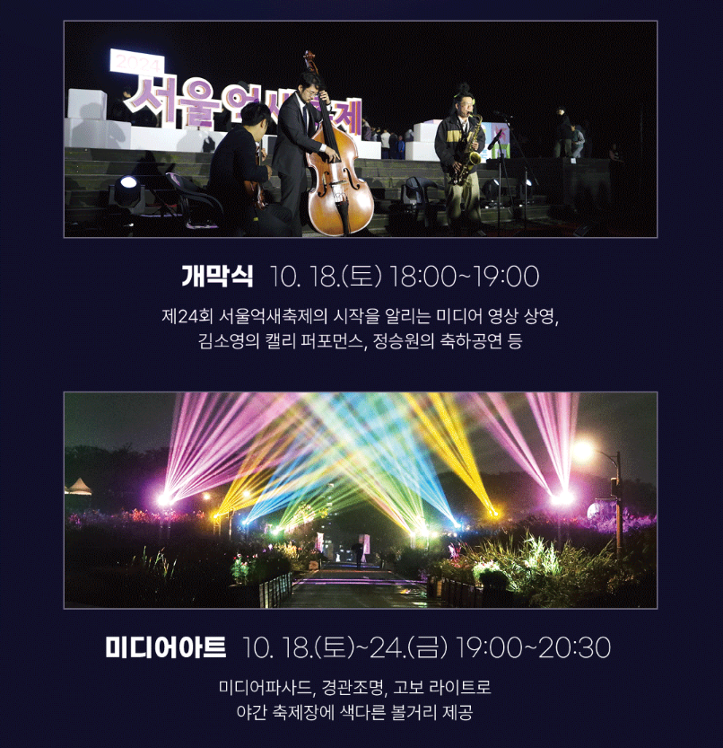 | 주요 프로그램 | - 개막식 (미디어 영상, 퍼포먼스) - 미디어존 야간 조명 & 영상 연출 - 아트 설치 전시 (조형물, LED 작품 등) - 버스킹 공연 (클래식, 재즈 등) - 체험 프로그램 (억새 꽃다발 만들기, 워크숍 등) - 포토존 & 소원존 운영 - 공원사진사 사진전 |