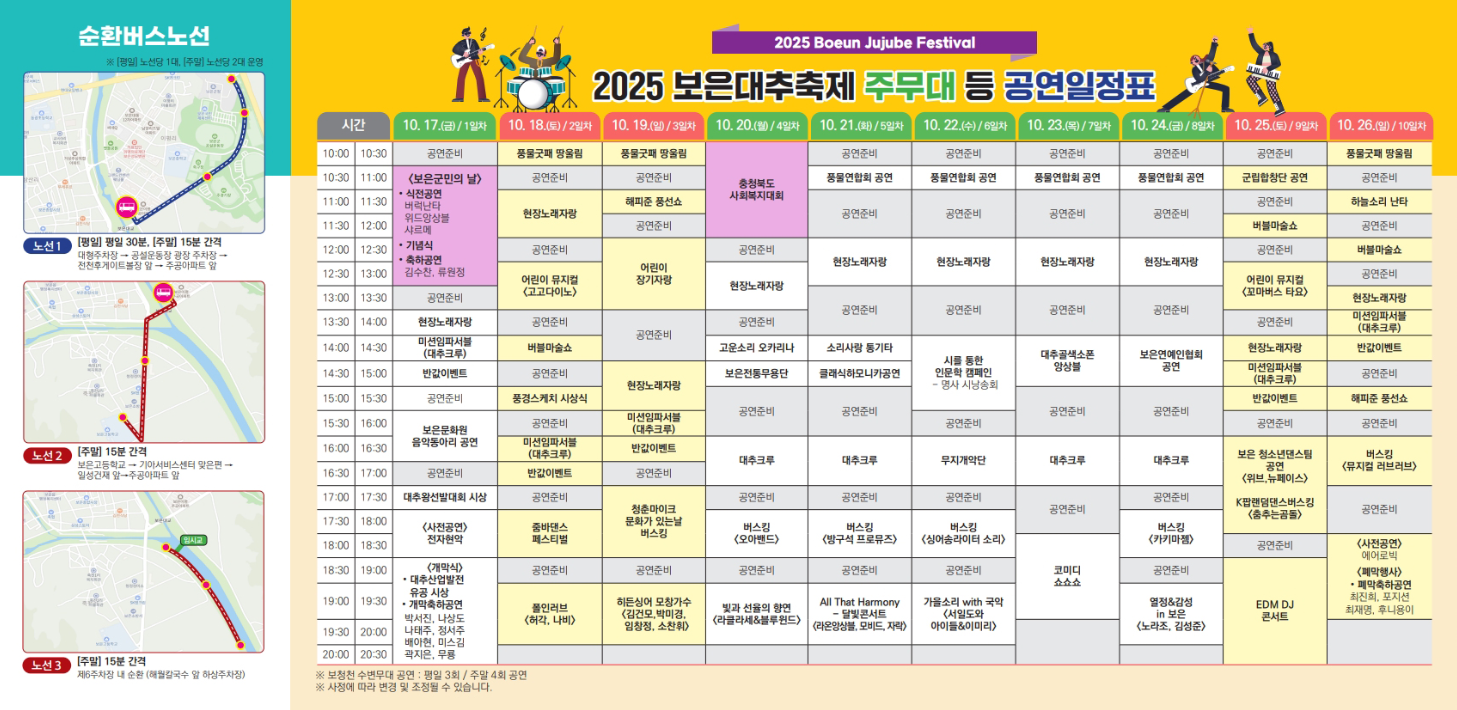 | 행사 | - 개막 및 폐막 축하공연 (박서진, 허각, 나비, 노라조 등 다양한 가수) - 다양한 공연 및 퍼포먼스 (K팝 랜덤댄스, 버스킹, 전자현악 등) - 참여형 이벤트 (대추크루 미션, 반값 이벤트, 대추왕 선발대회) - 신선한 보은 대추 및 농특산물 판매 |