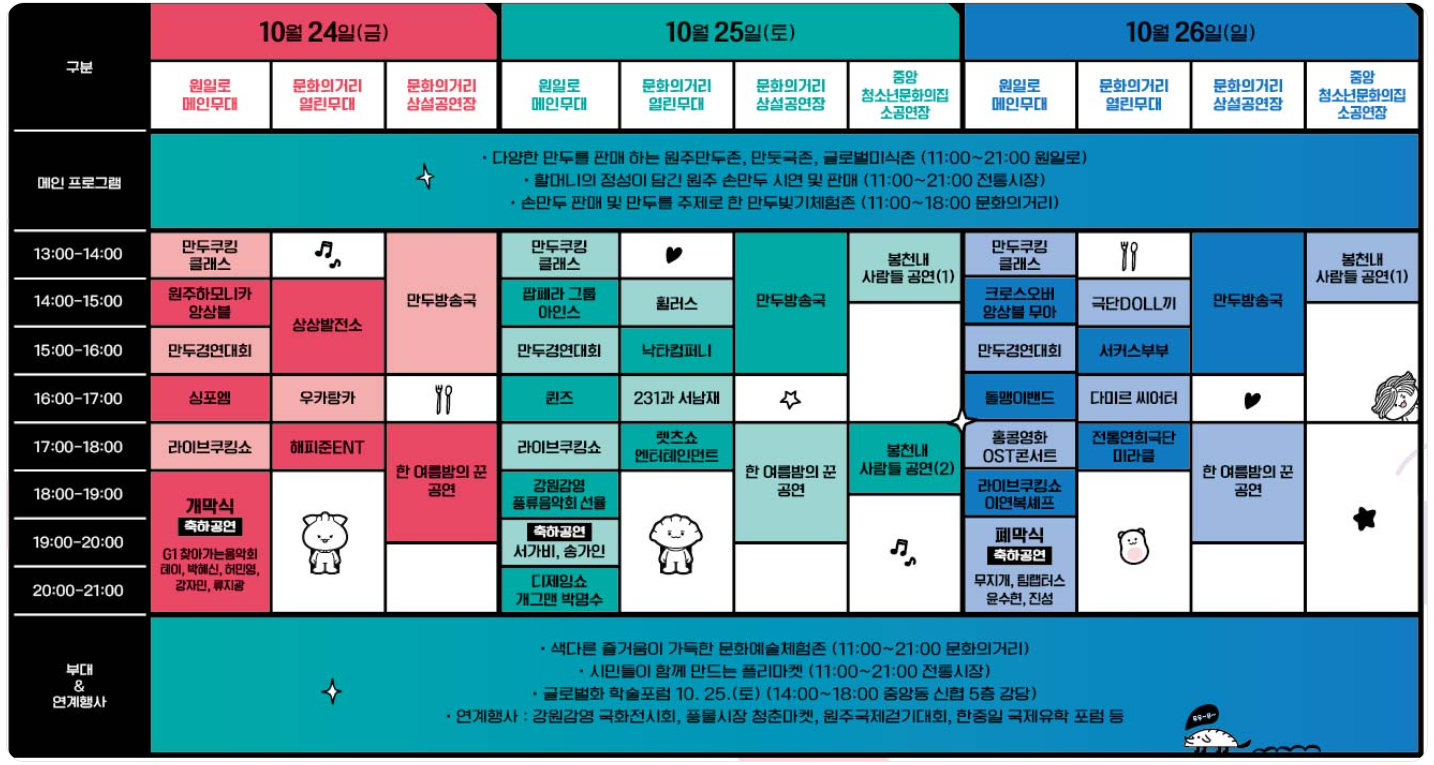 | 주요 프로그램 | 만두 미식존(한국식·세계식), 만두 빚기 체험, 공연 무대(가수 공연 포함), 프리마켓·플리마켓 등 |