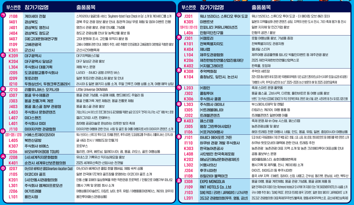 | 전시 품목 / 주요 내용 | 관광 유관기관, 국내외 패키지·자유여행사, 테마파크·리조트·액티비티, 숙박·항공·체험·관광기념품 등 |