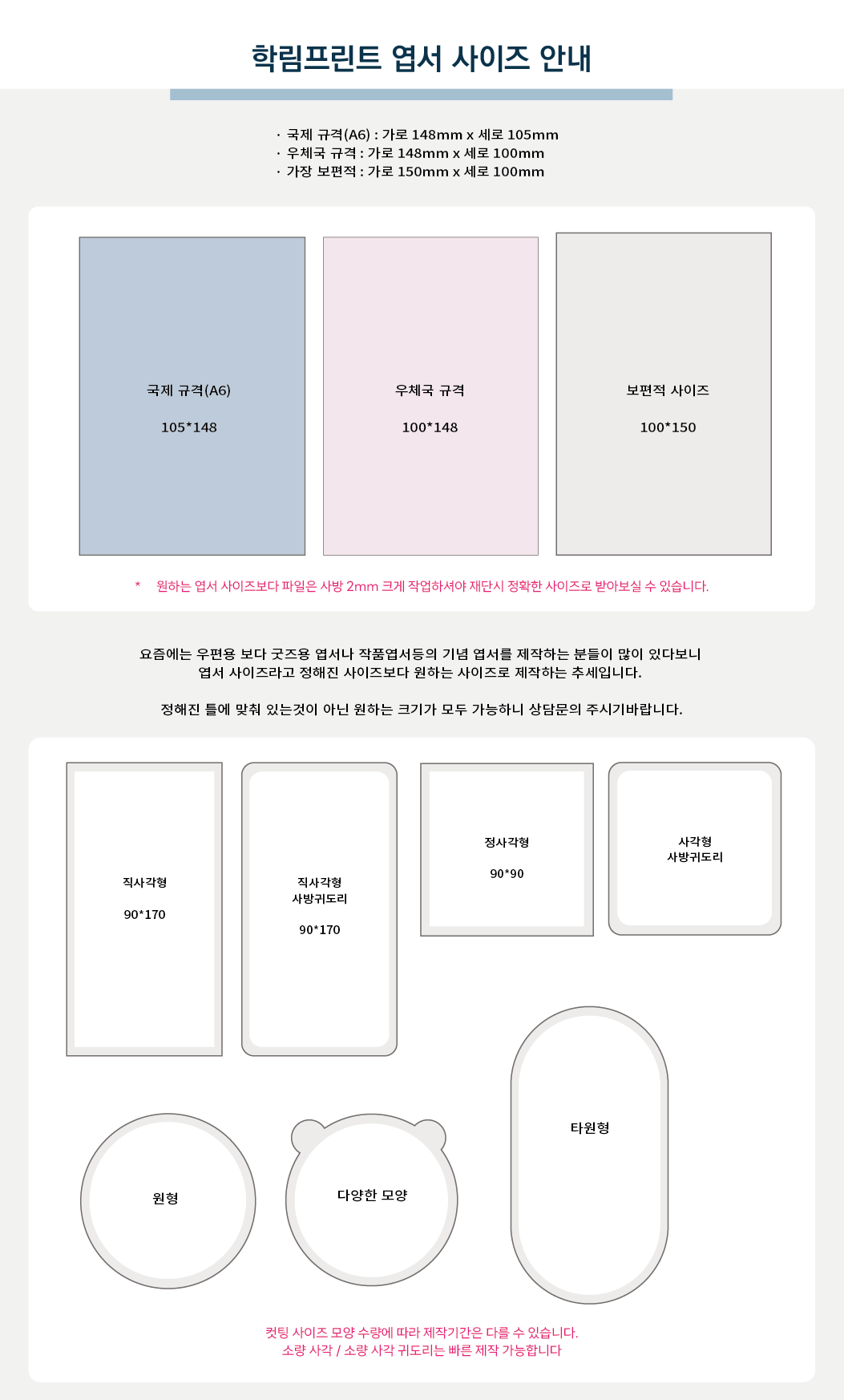 - 동일한 디자인으로 바로 생산되는 제품이 아니라, 고객님이 원하시는 크기·재질·후가공·수량에 맞춰 제작해 드립니다.