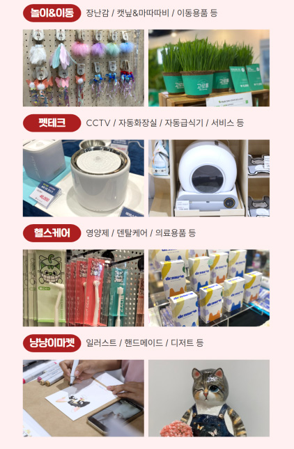 | 전시 품목 / 주요 내용 | 고양이 사료·간식, 장난감, 가구·캣타워·이동장, 위생·배변용품, 헬스케어, 캐릭터 굿즈·핸드메이드 MD까지 반려묘 전반 아이템 |