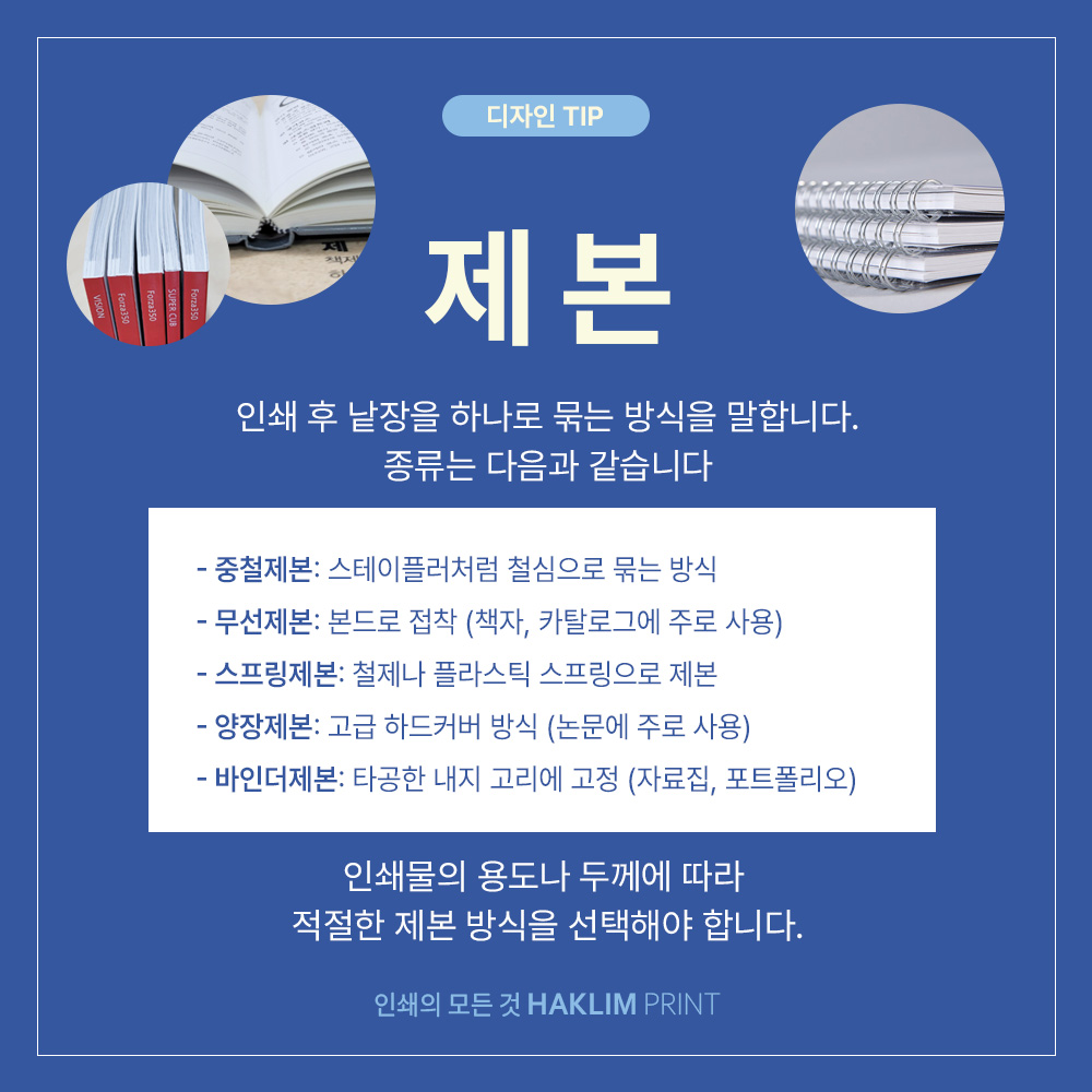 안녕하세요.인쇄의 모든 것, 학림프린트 입니다 :) 오늘은 제본 종류에 대해 알아보겠습니다. 링제본 Wire Binding 와이어 링제본은인쇄된 종이에 구멍을 뚫어 트윈링을 끼우고 제본기로 눌러서