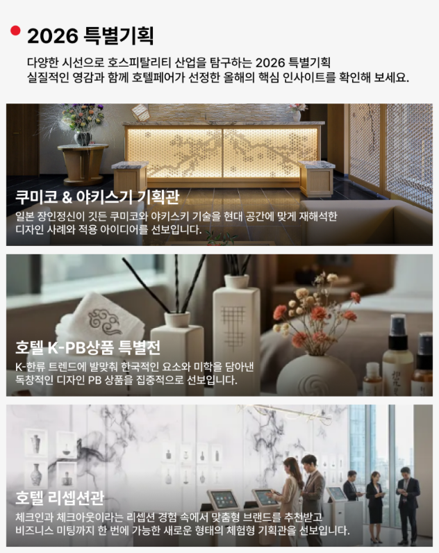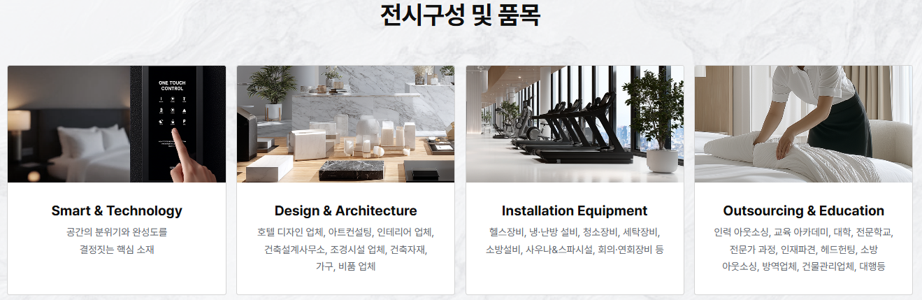 | 전시 구성 / 주요 내용 | 호텔 개발·건축 자재·공간 디자인, 인테리어 · 가구 · 조명 · 텍스타일, 객실·서비스 비품, 스마트솔루션, 운영지원, 식음료(F&B) 등 종합 전시 |