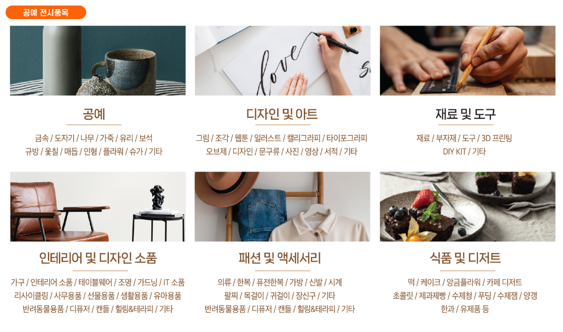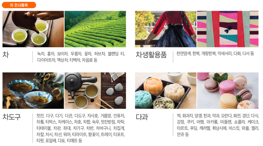 | 전시 품목 / 주요 내용 | 차(Tea) 및 다과·식품, 차 용품(다구·도구), 공예 작품·생활소품, 인테리어 소품, 패션·액세서리, 공예 문화 콘텐츠 등 |
